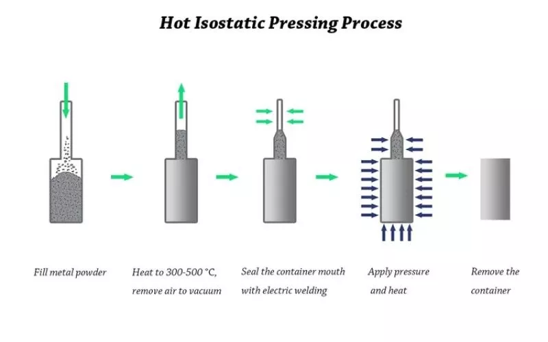 مخطط سير عملية الضغط المتساوي الضغط الساخن: المسحوق ← التشكيل ← التلبيد