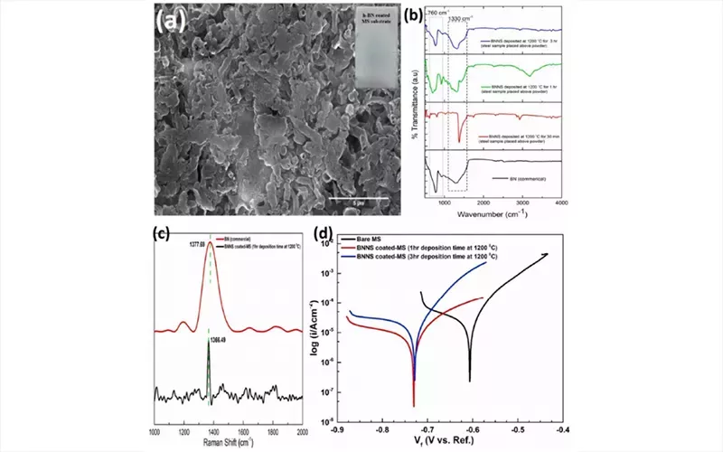 في هذه الدراسة، تم ترسيب صفائح نانوية من نتريد البورون بنجاح على الفولاذ الصلب باستخدام الترسيب الكيميائي للبخار (CVD). خضع الطلاء، المكون من 80% BNNs، للترسيب عند درجة حرارة 1200 درجة مئوية. تم تنظيف شرائح الفولاذ الطري باستخدام 5% HCl وNaOH.