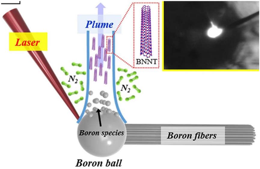 Une cible de bore en poudre est consommée à l'aide d'un laser haute puissance dans une enceinte remplie d'azote. L'azote fournit ensuite l'élément manquant pour créer des BNNT. Bien que cette technique soit efficace pour fabriquer des BNNT de haute qualité cristalline, son rapport coût/bénéfice ne favorise pas la production de masse.