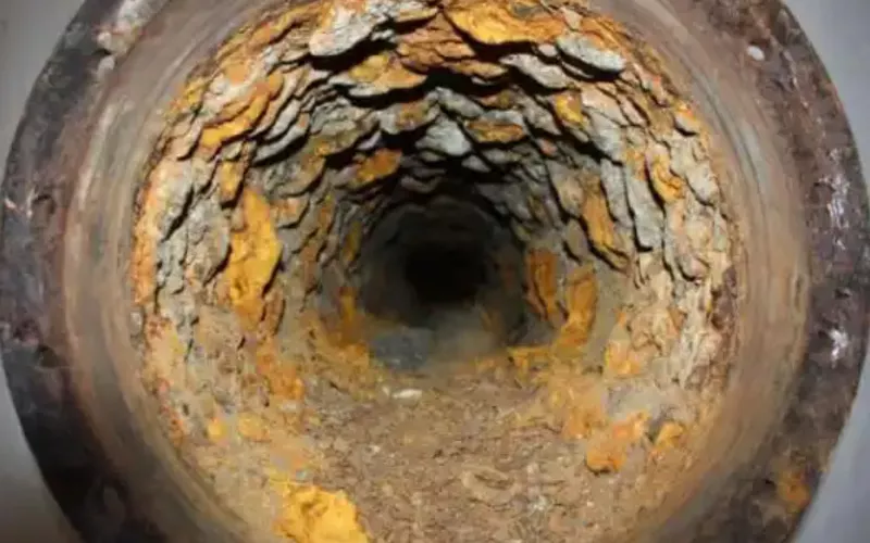 The corrosion process forms various pits (circular, oval, and long), which slowly penetrate the metal vertically from the inside, eventually causing the metal wall to become thinner or even perforated.