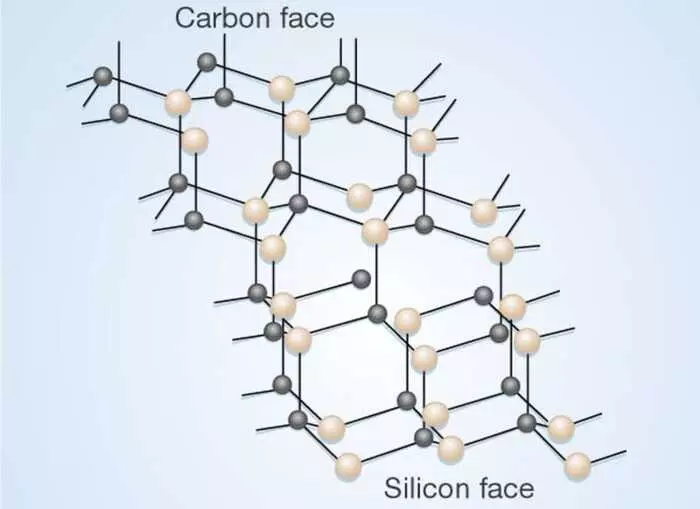 The figure shows you four carbon atoms and four silicon atoms bonded with a central silicon and carbon atom. The four carbon and four silicon atoms link through their corners to form a tetrahedral unit. You realize that when stacked, the units form a polar structure called a polytype. 4H-SiC is an example of a polytype.